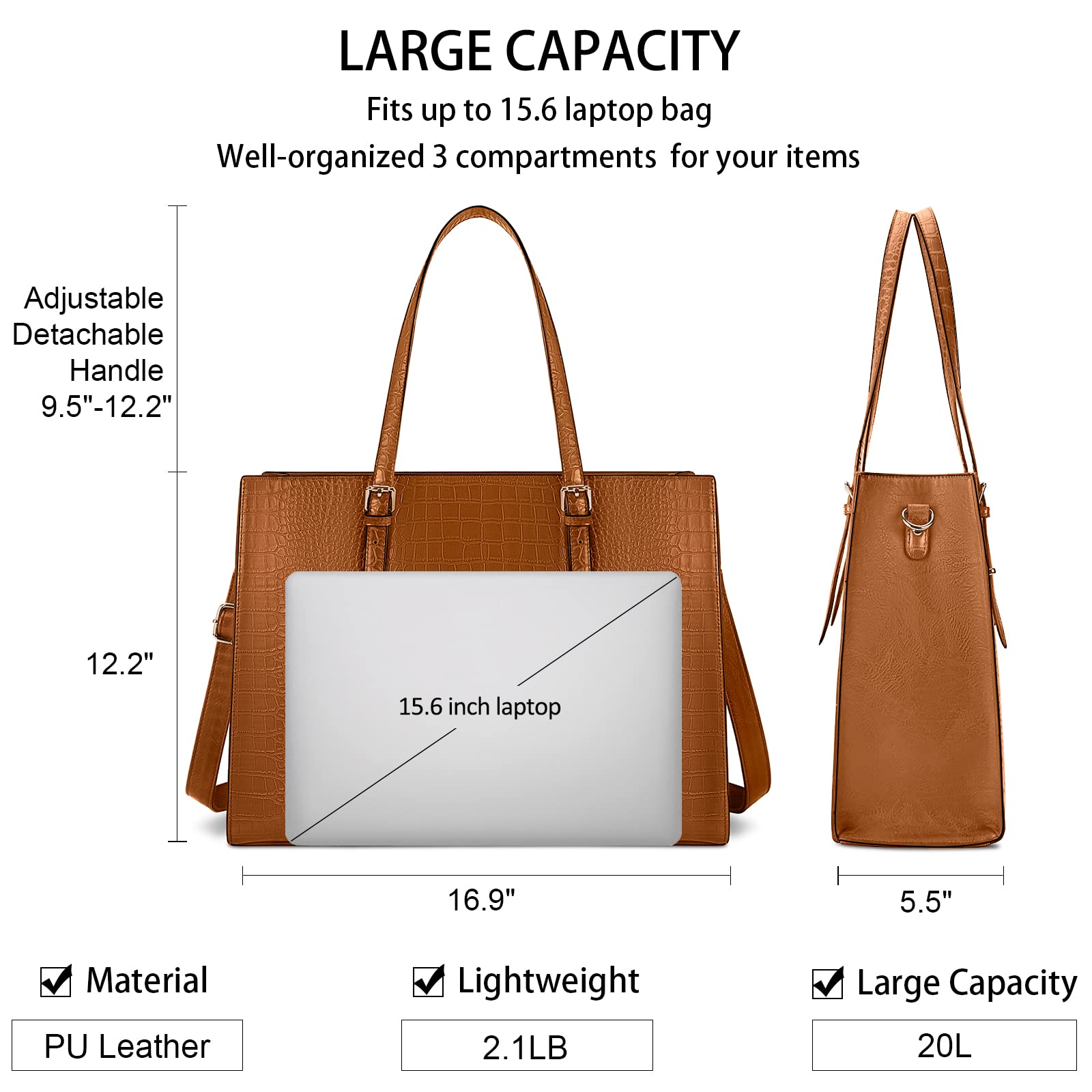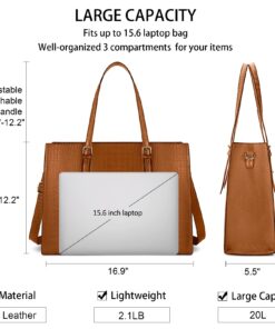 - Suitable Size of Handbag: The dimension of shoulder bag is 16.9 x5.5 x12.2 inch ; Handles drop: 9.5-12.2inch; Weight: 2.1 lbs.Women computer bag provide comfortable handle and adjustable and detachable shoulder strap, finished with a secure zip-top closure. With such large organized handbag, it meets all your daily supplies.
